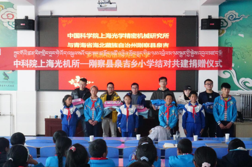 为深入贯彻习近平总书记系列重要讲话精神,进一步抓基层、打基础,充分发挥基层党组织战斗堡垒作用和党员先锋模范作用,响应“让科学普及和科技创新比翼齐飞”的号召,10月28日至31日,中国科学院上海光学精密机械研究所党委办公室、结对党支部和科学传播办公室代表,以及科普志愿服务队与青海省海北藏族自治州刚察县泉吉乡民族寄宿制完全小学(泉吉小学)开展结对助学和科普活动。泉吉小学校长更藏东知布,副校长谢志祥、胡吉东,以及四、五、六年级全体学生参加了结对助学仪式。