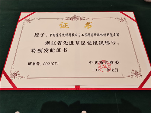 7月1日上午,浙江省庆祝中国共产党成立100周年大会在嘉兴举行,大会表彰了全省各领域涌现出的优秀共产党员、优秀党务工作者和先进基层党组织。中科院宁波材料所磁性材料党支部获得浙江省“先进基层党组织”荣誉称号。