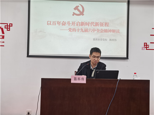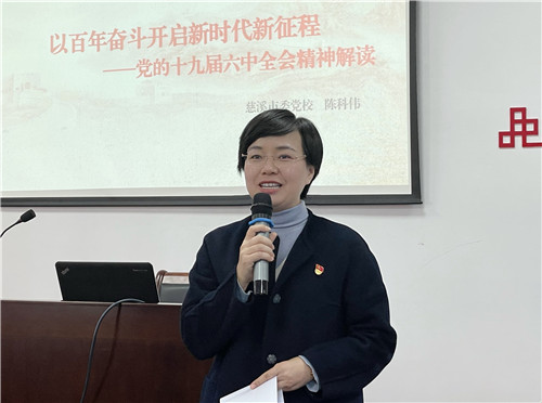 慈溪市委党校陈科伟老师为全体学员做了题为《以百年奋斗开启新时代新征程》的主题报告,详细解读了十九届六中全会精神。在报告中,陈科伟从历史背景、重要意义、报告结构、重点内容等方面对十九届六中全会审议通过的《中共中央关于党的百年奋斗重大成就和历史经验的决议》进行了深入解读。通过对比党的历史上的三个《决议》的产生背景及深远影响,进一步阐释了《中共中央关于党的百年奋斗重大成就和历史经验的决议》的重要意义。同时,以坚持正确历史观、百年党史的四个阶段与社会主要矛盾变化、马克思主义中国化的三次历史性飞跃、中国特色社会主义新时代的基本特征等为切入点,对《决议》的丰富内涵和现实意义进行了分析。最后,他指出,各位学员要积极响应党中央号召,将十九届六中全会精神学懂、弄通、做实,并在科技创新事业中贯彻落实到位。
