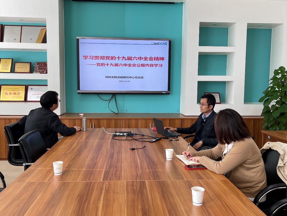 11月19日上午,中国科学院上海硅酸盐研究所特种无机涂层研究中心党支部召开了党史学习教育学习贯彻党的十九届六中全会精神主题党日活动。活动就十九届六中全会精神开展集体学习,并传达学习了中科院基础研究工作会议精神,对研究所“支持基础研究工作方案”作了解读。会上还举行了“师徒结对”结题分享与签约仪式。中心党员及青年科研骨干30余人参加会议,会议由支部书记孟佳主持。