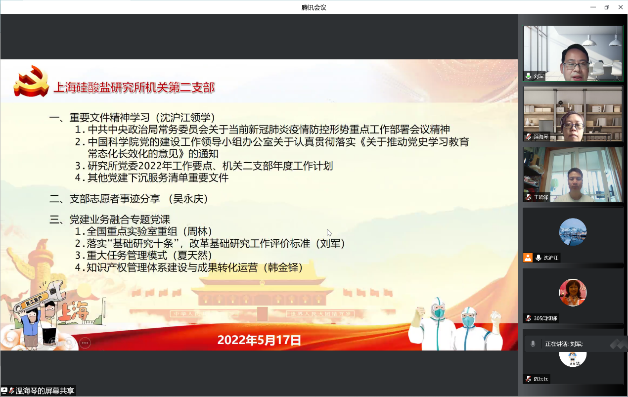 5月17日下午,中国科学院上海硅酸盐研究所机关第二党支部组织召开党建与业务融合线上专题学习会。会议由党支部书记刘军主持,支部全体党员和科技发展部所有职工群众参会。