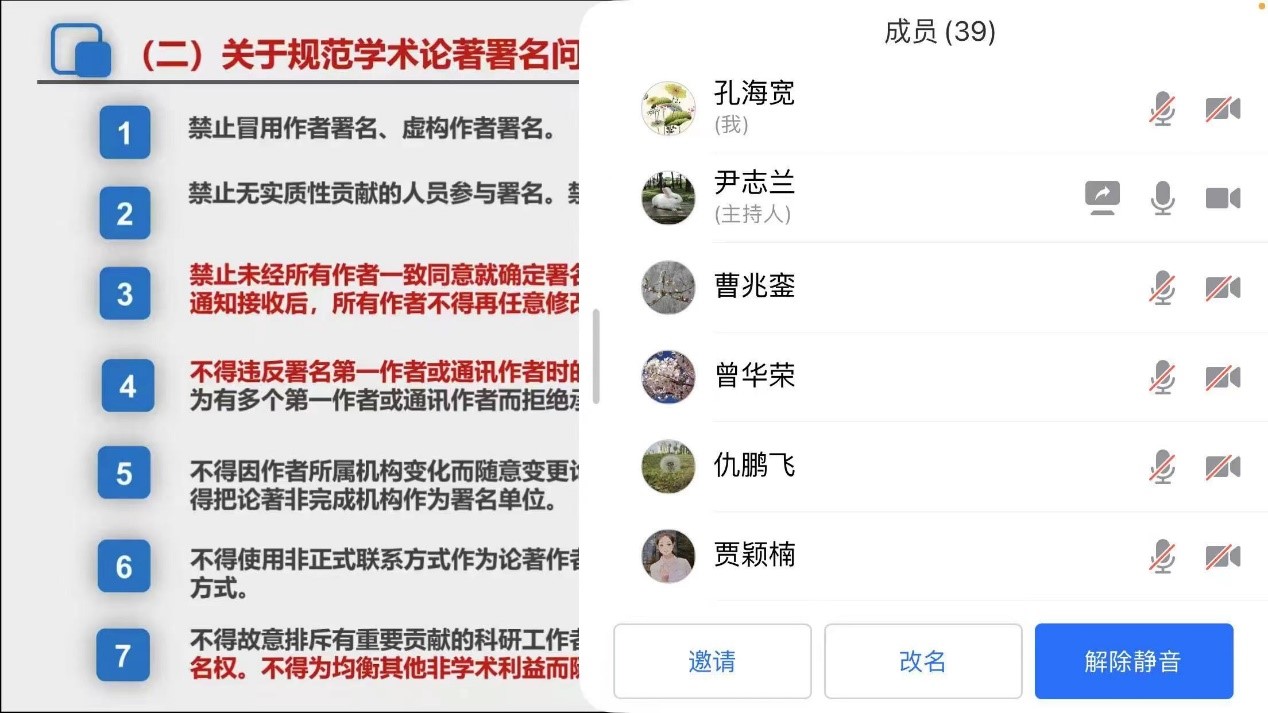 纪委副书记、科研道德委员会副主任于云传达了中科院2022年度科研诚信建设工作会议精神,领学了中科院近期发布的《关于在科技奖励推荐过程中常见问题的诚信提醒》,介绍了科研道德委员会2022年度重点工作及科研诚信专题辅导报告等开展情况。她表示,各部门、课题组要及时学习贯彻中科院科研诚信建设工作会议精神及科研诚信提醒,组织科研人员学习中科院历年科研诚信提醒文本,不断提高科研诚信意识、规范科研诚信行为。
