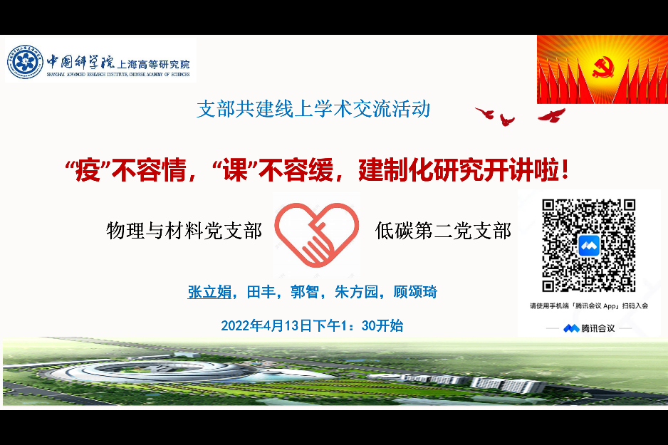 为了在疫情居家办公期间保证建制化项目稳步推进,响应高研院定向性建制化试点改革,进一步提高原始创新能力,活跃学术氛围,低碳第二党支部和物理与材料党支部于2022年4月13日通过线上会议的形式,围绕联合承担的“面向CO2的光子科学研究”建制化项目课题,结合相关研究内容,开展了一次支部共建学术交流活动。
