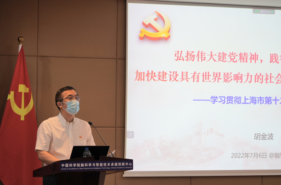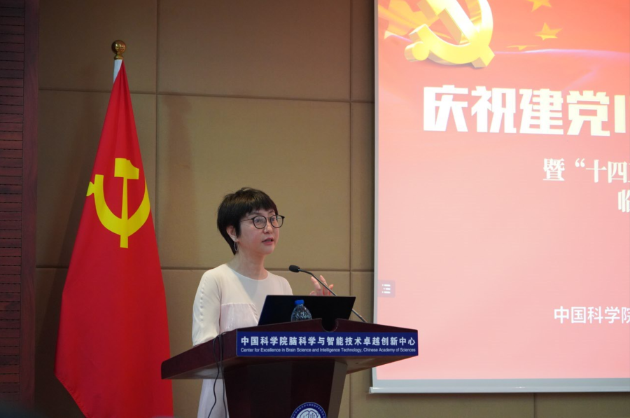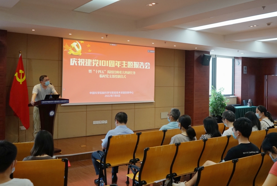 为庆祝中国共产党成立101周年,2022年7月6日,中国科学院脑科学与智能技术卓越创新中心举办庆祝建党101周年主题报告会暨“十四五”揭榜挂帅重大科研任务临时党支部授旗仪式。会议由党委副书记(主持工作)、副主任王燕主持。中心领导班子成员、两委委员、党支部书记、支部委员、群团组织负责人、科技骨干、群团组织代表、党员代表、党外人士代表、部门负责人等近200人通过线上和线下的形式参加了会议。