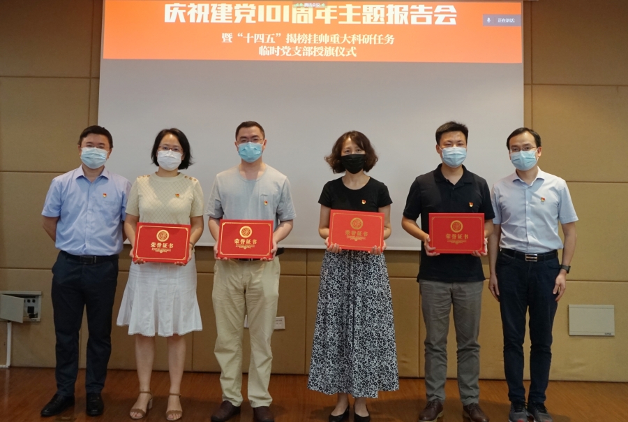 会议的最后一个环节是“十四五”揭榜挂帅重大科研任务临时党支部授旗仪式,王燕为临时党支部授旗,中心副主任(主持工作)杜久林和临时党支部成员合影留念。