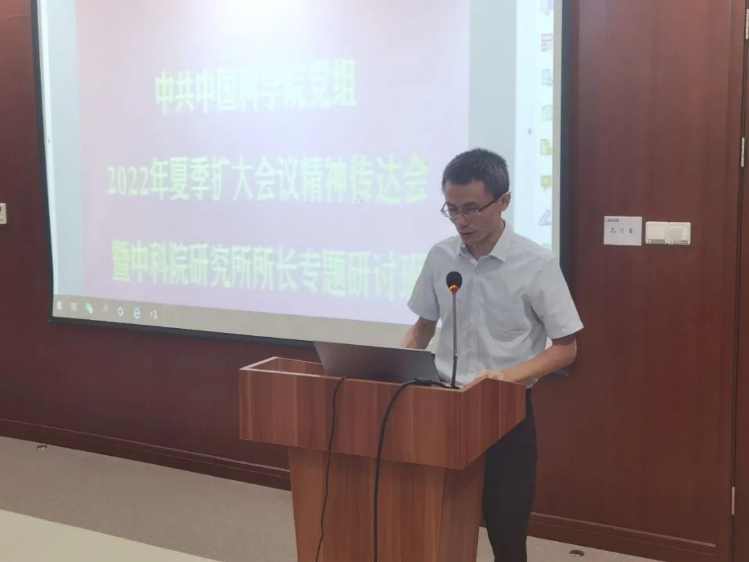 综合办公室(党委办公室)主任毛朝梁传达了2022年院党组夏季扩大会议精神,强调要将深入学习贯彻落实会议精神作为未来一段时间的重要政治任务;机关第一党支部书记、人力资源处副处长张灿周作中科院人才工作会议精神宣贯解读,并汇报了研究所人才工作的开展情况;机关第二党支部书记、科技综合处处长刘军作院国重重组精神宣贯,并传达了我所国重重组进展情况;机关第三党支部书记、安全与保障管理办公室副主任宋桂兰传达中共中国科学院上海分院分党组关于开展向赵景柱同志学习活动的通知要求。