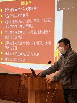 史迅同志宣读了入党志愿书,汇报了个人情况并表明自己的入党动机及决心;入党介绍人姚琴、王冉冉对史迅同志在培养考察期内的表现向大会作了详细介绍并表明了自己的意见;支部书记刘建军报告了史迅同志的发展审查情况;与会党员发表意见,大家一致认为,史迅同志在政治上能与党中央保持一致,能以身边党员为标准规范自己的言行,作风正派,团结同志,较好地发挥了带头作用。经与会正式党员投票表决,大会通过了接收史迅同志成为中共预备党员。