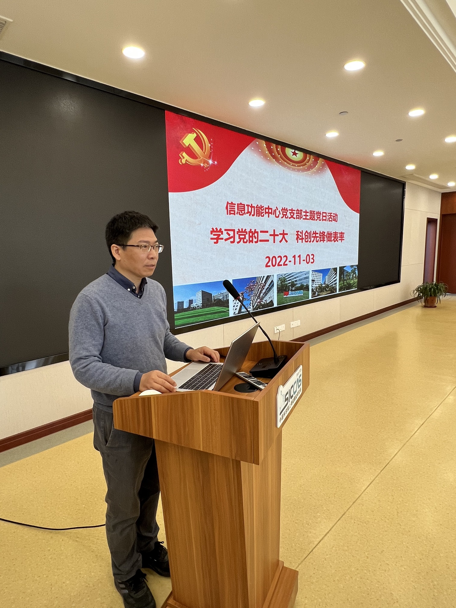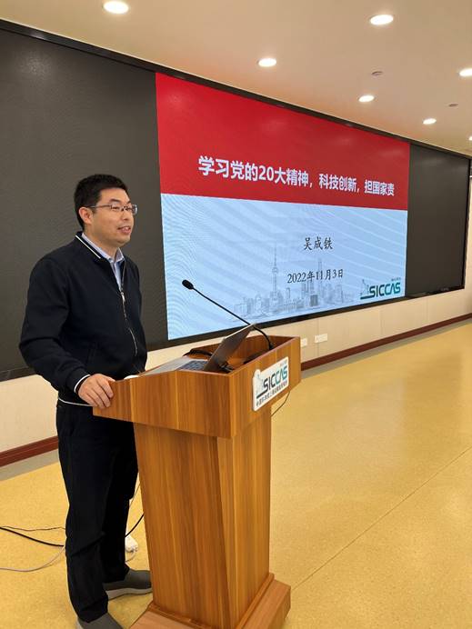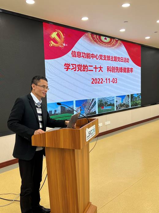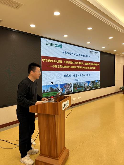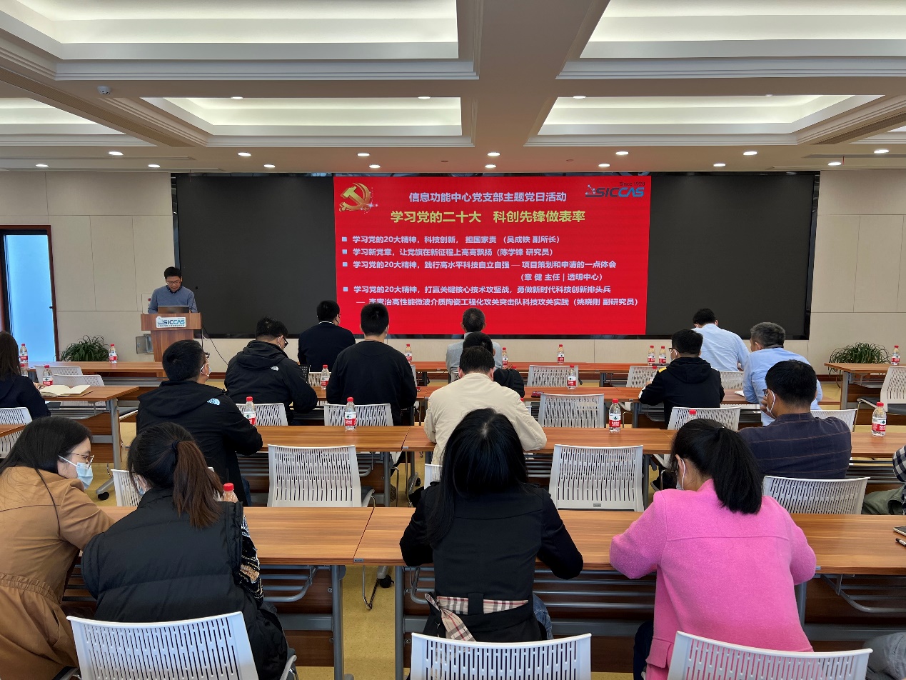 11月3日上午,中国科学院上海硅酸盐研究所信息功能材料与器件研究中心党支部开展“学习党的二十大 ,科创先锋做表率”主题党日活动。副所长吴成铁,综合办公室(党委办公室)主任毛朝梁,透明陶瓷研究中心主任章健应邀参会。信息功能中心主任王根水、支部党员、科研人员和研究生等40余人参加了此次活动。活动由中心副主任、党支部书记曾华荣主持。