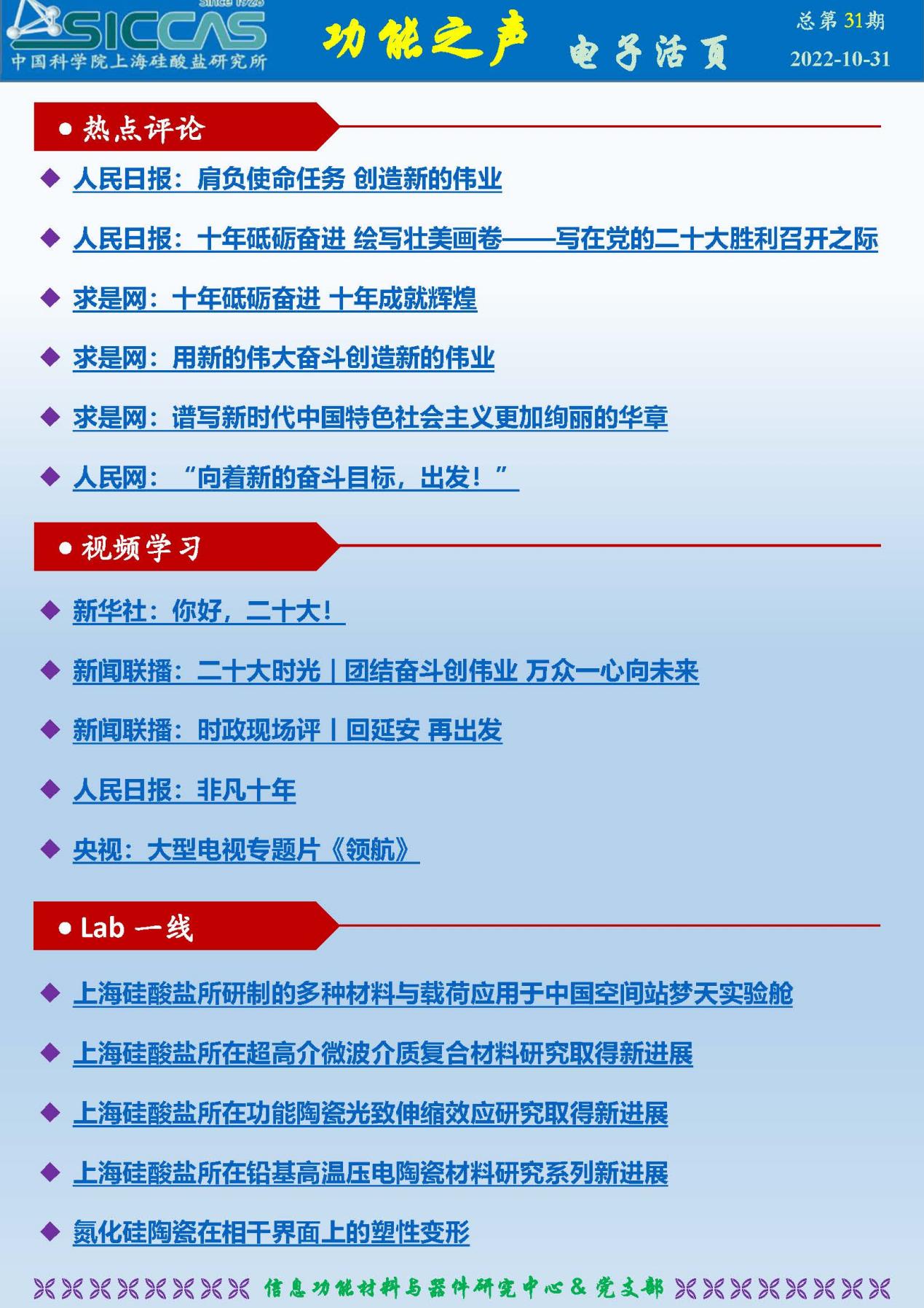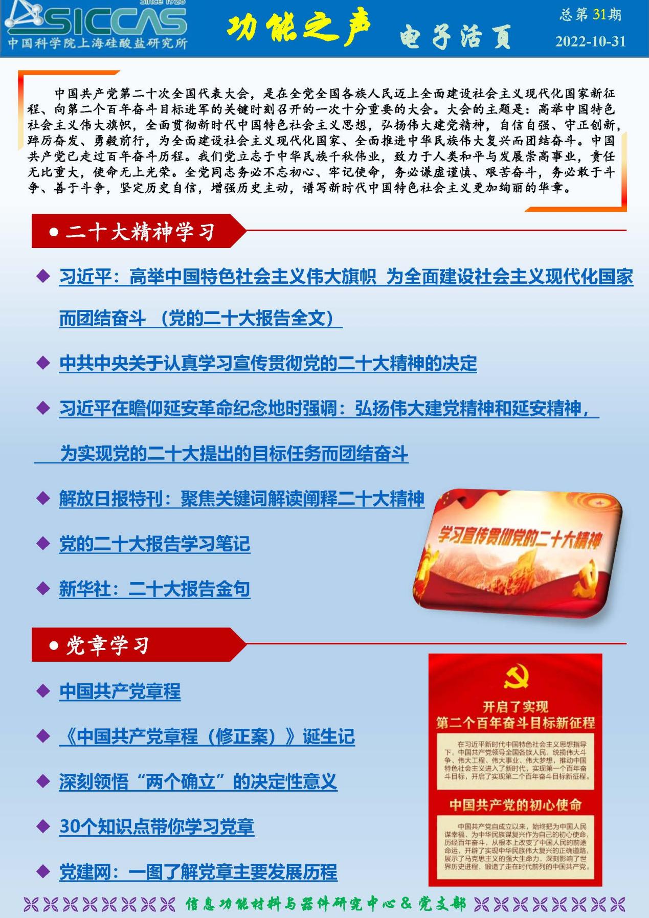 活动同时发布了最新第31期《功能之声》电子活页。本期聚焦党的二十大精神宣贯和学习,包括“二十大精神学习”、“党章学习”、“热点评论”、“视频学习”、“Lab一线”等五个专题,旨在全方位多角度多形式推动中心全体人员深入学习党的二十大精神,扎实推动党的二十大精神落实落地,进而推动开创科技创新事业发展新局面。