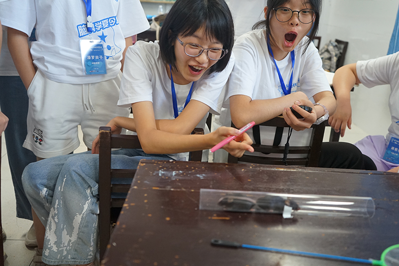 科普志愿者带领营员们开展了空间视觉错觉、触觉错觉、假手错觉、斯特鲁普效应等经典实验,了解大脑多感觉整合的功能。通过自制条件化装置,以小鼠为实验对象,探索了动物社交等级、动物运动能力测试的研究范式,引导营员们建立科学思维来探索大脑的奥秘。