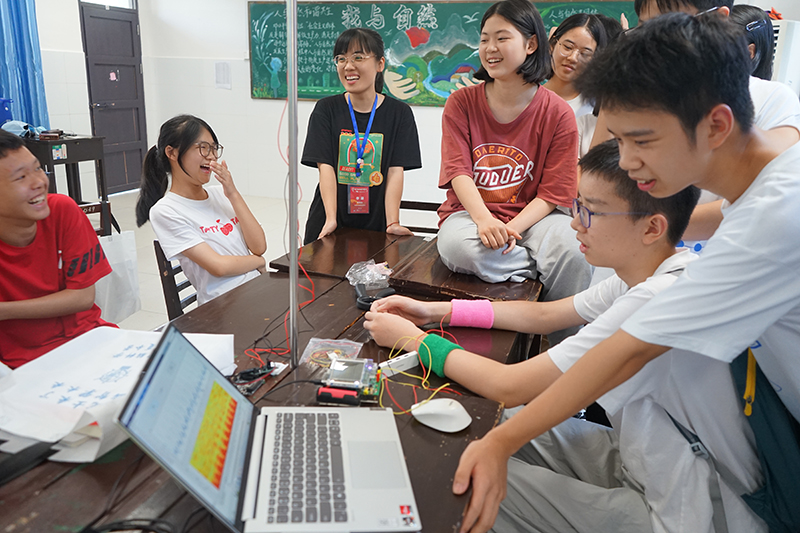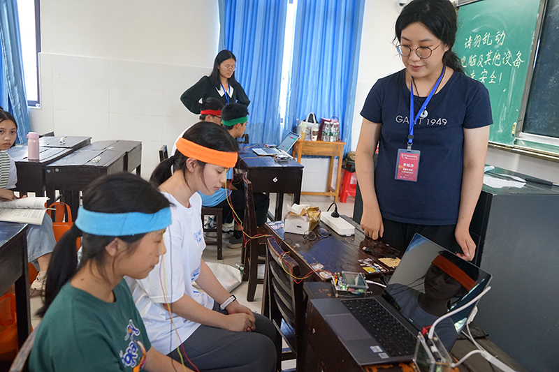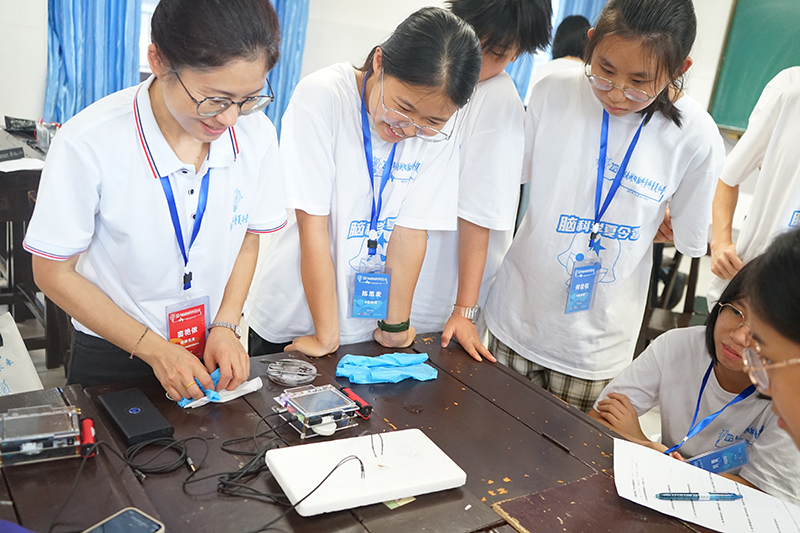 科普志愿者在出发前精心设计,为实验量身定制了轻巧便捷的生物电测量仪,将日常看不见、摸不着、感受不到的脑电、肌电信号,采取信息化手段和趣味性比赛、协同合作等方式呈现出来,通过“发光”的肌肉,真心话大冒险、眼电“遥控”车、注意力对抗赛、意念协作竞速赛、僵尸跳舞、斑马鱼的学习记忆与焦虑等实验,来加深中学生对脑电、肌电、动作电位等基本概念的理解。