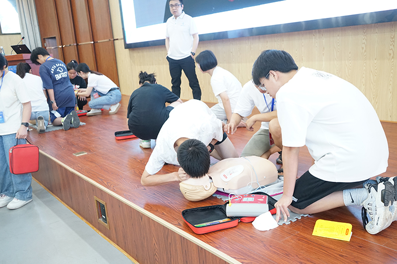 中南大学湘雅二医院临床技能训练中心主任李瑛教授为营员们详细讲解了心肺复苏等急救知识。导师们分组展示了现场救护的原则,以及溺水、出血、骨折、扭伤、烧烫伤、中暑、晕厥、抽搐等常见意外伤害的预防和现场救护操作流程,并对每个学员的急救细节进行了指导。