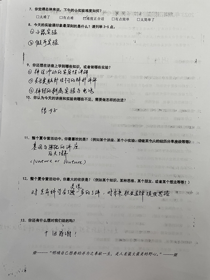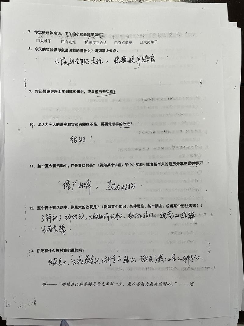 浏阳一中的营员代表于朗懿表示,三天来他体会到了责任与担当,院士爷爷的悉心讲解、老师们的细心指导,让营员们在知识的海洋里快乐徜徉,所有营员们对科学技术展现出浓厚的兴趣,未来的种子已悄然在心里种下,成长于浏阳一中的校园。浏阳一中校长苏飞跃表示,这次夏令营使同学们领略到了科学的魅力,感受到了院士、专家们严谨认真的治学态度,求真务实的科学精神和热心公益的奉献精神,相信参加这次科普夏令营的同学中,一定会涌现一批勤思考、肯钻研、勇担当的未来科技之星,接过科学探究的接力棒,为国家科技发展、民族伟大复兴作出贡献。此次脑科学科普夏令营征集了营员们对活动的感受,营员们纷纷表示,对接触到的新奇科学现象、感受到的科学魅力以及实验成功所带来的喜悦印象深刻。