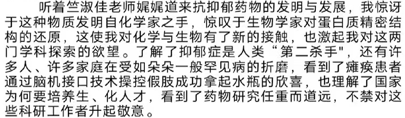 陈国强院士以《健康与疾病》为主题,多维度、多层次地展示了什么是真正的“健康”和“疾病”,向同学们讲解了人类关于健康与疾病的认识。陈国强尤其关注青少年抑郁症的产生,他鼓励同学们奋力追梦的同时,一定要注重心理健康教育,建设强大的内心世界。