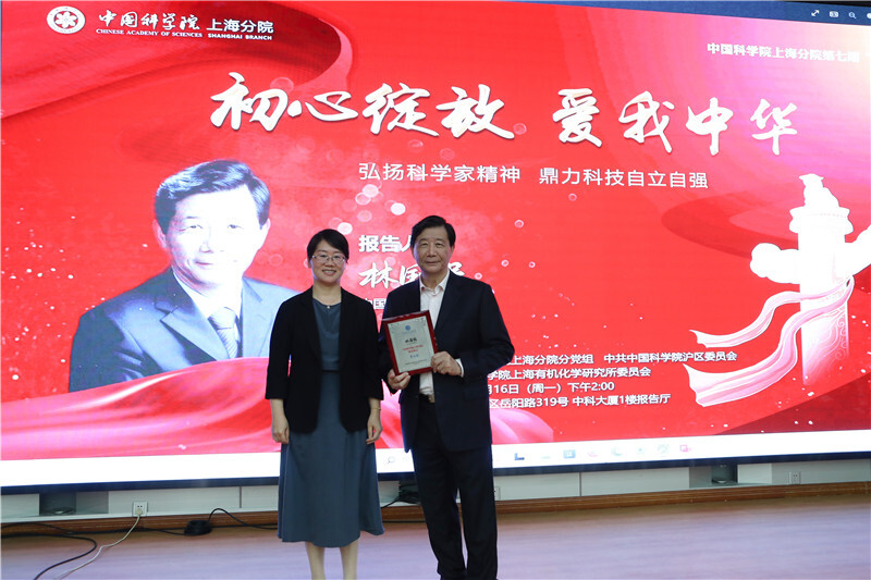 报告会上,李晴暖为林国强院士颁发“报国讲坛”纪念牌。她表示,在中华民族伟大复兴的征程上,一批又一批老一辈和新时代科学家心系祖国和人民,怀着深厚的爱国主义情怀,凭借精湛的学术造诣、宽广的科学视野,前赴后继、赓续奋斗,为祖国科技事业作出彪炳史册的重大贡献。正如林国强以国家需求为奋斗目标,始终保持共产党员为人民服务的初心,坚持基础科学与社会发展相结合,研发药物造福与民。这些伟大精神引领伟大事业,激励着年轻一辈科学家学习他们以爱国、创新、求实、奉献、协同、育人为鲜明特征的科学家精神。