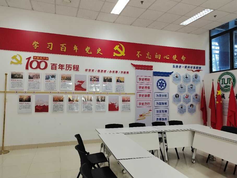 党群活动室展厅分为四个主要主题。第一部分是党史、科学家史宣传板块,包括中国共产党百年历程以及为党分忧、为国解难、攻坚克难、勇攀高峰的老一辈科学家精神的介绍;第二部分是科学家故事板块,包括城市所院士风采、聚焦国家重大需求和发挥党员先锋模范作用三个部分;第三部分是城市所创新文化角板块,展示城市所创新文化大赛各类作品,体现城市所优秀的建所文化;第四部分是党建工作板块,主要是城市所获得各级表彰的两优一先典型以及城市所“一二三四”党建工作法,体现党建引领科研,研究所的组织管理能力。