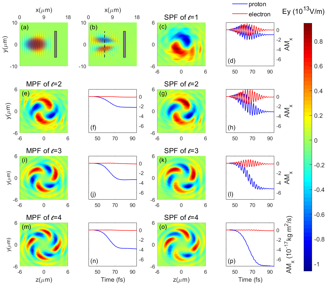 图2. 用两个不同系列的等离子体螺旋相位板(SPF和MPF)产生具有不同拓扑荷的涡旋光束和靶内粒子的角动量振荡效应