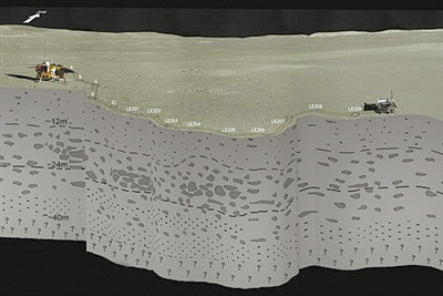 其中,第一单元为月表到地下12米的细粒月壤,内嵌有少量石块,这一层形成于多个撞击坑互叠的溅射物之上;第二单元为地下12米到24米的溅射物沉积层,其内部存在大量石块,甚至形成了碎石层和碎石堆;第三单元为地下24米到40米,是更古老的溅射物在不同时期沉积和风化的产物。