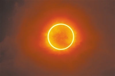 与以往日环食不同的是,此次日环食非常接近全食。太阳整个圆面超过99%的面积被遮住,剩下的一圈金边儿非常细。