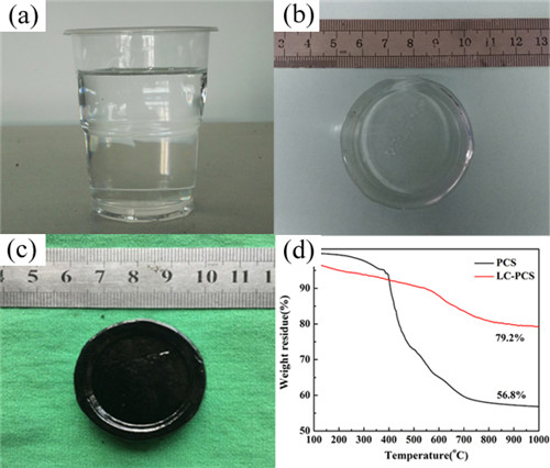 图1 (a)LC-PCS;(b)交联固化产物;(c)1200℃裂解产物;(d)PCS和LC-PCS的TG曲线