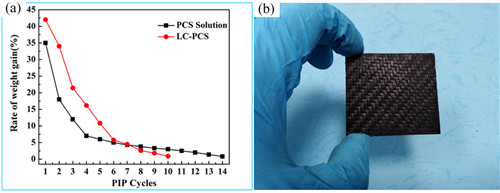 图2 (a)LC-PCS和PCS溶液浸渍周期-增重曲线;(b)LC-PCS为先驱体所制得2D Cf/SiOC