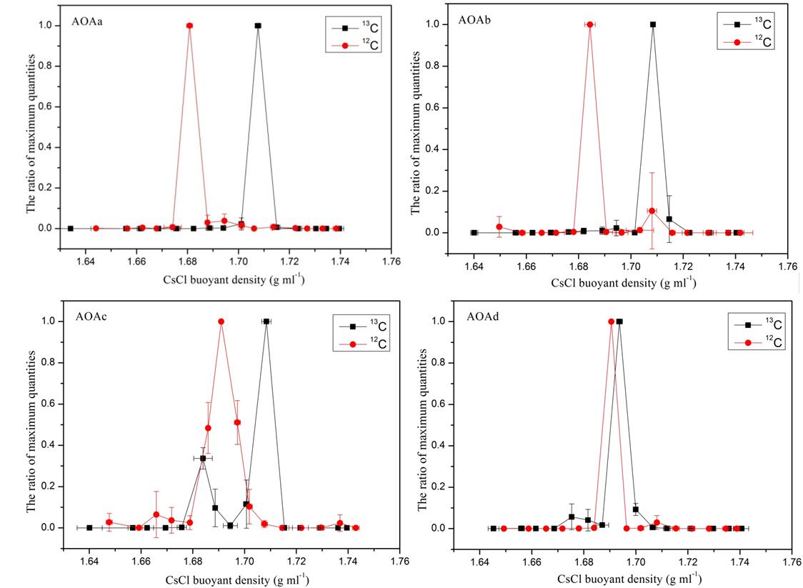 基于此,中国科学院城市环境研究所姚槐应研究组采用13CO2标记结合同位素探针(DNA-SIP)技术,分析了不同pH梯度(3.97-7.04)的菜地土壤中AOA、AOB和NOB的活性、丰度及群落组成。结果表明,土壤中AOA的丰度要显著高于AOB,且随着土壤pH的提高而降低;而NOB的nxrA基因在低pH土壤中丰度最高,而nxrB基因却在中性土壤中丰度较高。13CO2标记结果表明,在低pH土壤中(pH 3.97-6.07),13CO2主要是被AOA所同化,但是在中性土壤中(pH 7.04),AOA对13CO2的同化率明显降低;AOB则和AOA相反,只有在中性土壤中(pH 7.04)才有少量的13CO2被同化;然而,在本试验中没有证据表明NOB能同化13CO2。以上结果表明,此菜地土壤的硝化作用是由AOA主导的,进一步分析其群落组成,发现有活性的AOA主要属于Nitrososphaera属。本研究结果证实了在酸性土壤中,AOA是硝化作用的主要驱动者,而在中性土壤中,AOA和AOB均能起作用,但活性相对较低。