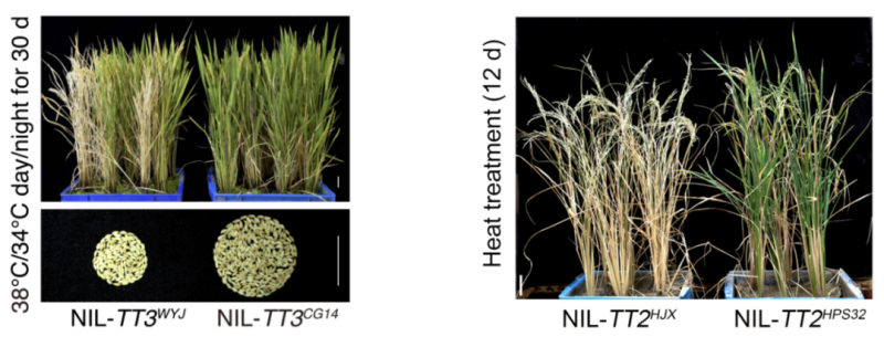 中科院分子植物科学卓越创新中心林鸿宣团队与上海交通大学林尤舜团队合作揭示水稻高温抗性的新机制,挖掘出由TT3.1和TT3.2组成的抗高温遗传模块TT3,同时首次发现第一个潜在的高温感受器(TT3.1),其感知并传递高温信号给叶绿体蛋白TT3.2,保护叶绿体免受热伤害;来自非洲稻的TT3.1-TT3.2模块显著增强高温抗性,在高温胁迫下比对照增产1倍。林鸿宣团队又挖掘出水稻抗高温基因TT2,首次揭示钙信号-蜡质代谢的抗高温新机制,在高温胁迫下TT2比对照增产54.7%。TT2和TT3成果为作物抗高温育种提供珍贵基因资源。
