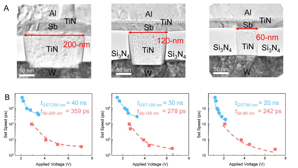 图1 不同尺寸单质锑相变存储器的(A)器件结构和(B)写操作速度。