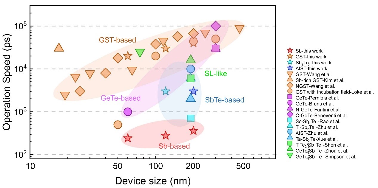图2单质锑相变存储器操作速度与已报道相变存储器件的对比。
