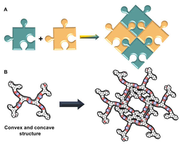 图1. 拼图的组装模式 (A) 和有机多孔分子晶体中类拼图的组装模式 (B)