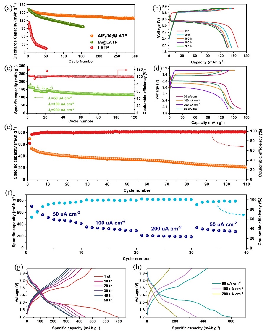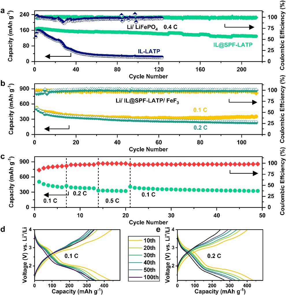 富氟界面改性的LiFePO4/LATP/Li和FeF3/LATP/Li电池循环性能