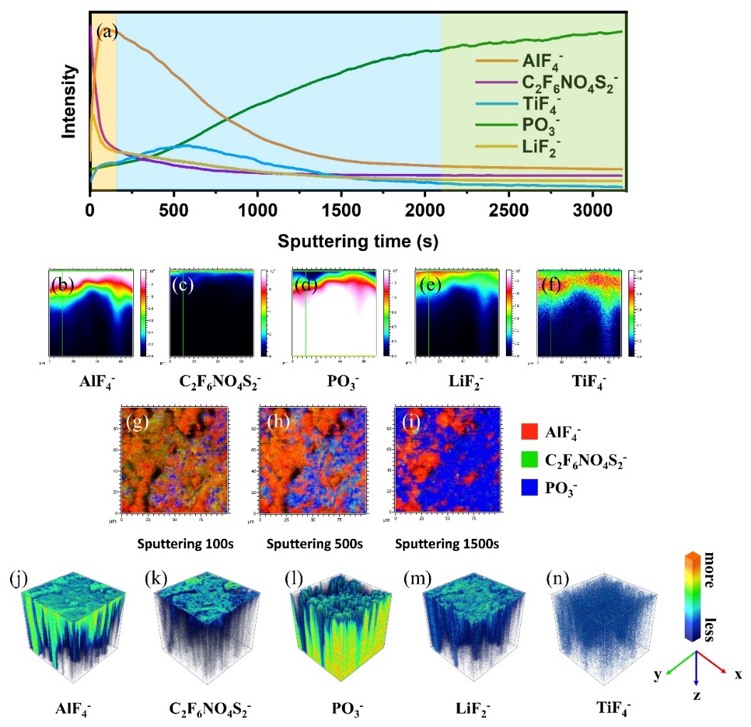 该团队提出基于高比表面积介孔AlF3的氟化修饰层来改进Li-LATP界面的稳定性和兼容性,界面的高路易斯酸性和多孔性可缓解循环过程中体积膨胀导致的应力,促进界面浸润剂中的锂盐解离和对阴离子TFSI-的吸附,使界面层中的锂离子迁移数高达0.74。AlF3对TFSI-的强亲和力有利于促进受限阴离子的分解,导致缺陷型LiF域在负极表面的形成,从而加强锂离子流的界面迁移和锂枝晶抑制。飞行时间二次离子质谱(ToF-SIMS)证实,在电化学过程中AlF3层会在LATP的近表面(通过形成Ti-F过渡层)促进富氟陷阱区的原位构建以捕获Ti4+,阻止其被还原成Ti3+。在循环过程中,Li-LATP界面发生电融合现象,将LATP电解质、AlF3界面层和Li负极焊接成一个整体,从而降低界面阻抗,保证快速的Li+界面迁移。该界面层可以持久保持Li-LATP界面的稳定性,使对应的Li/Li对称电池具有低的电位极化,并可稳定循环500小时以上。富氟过渡层调制的陶瓷型Li-FeF3固态电池可释放高达696.7 mAh g-1 的比容量,并具有良好的转换反应循环稳定性。这种正极和界面层双氟化的策略为高比能NASICON型固态电池提供了一种新的解决方案(Adv. Energy Mater. 13, 2203679, 2023)。