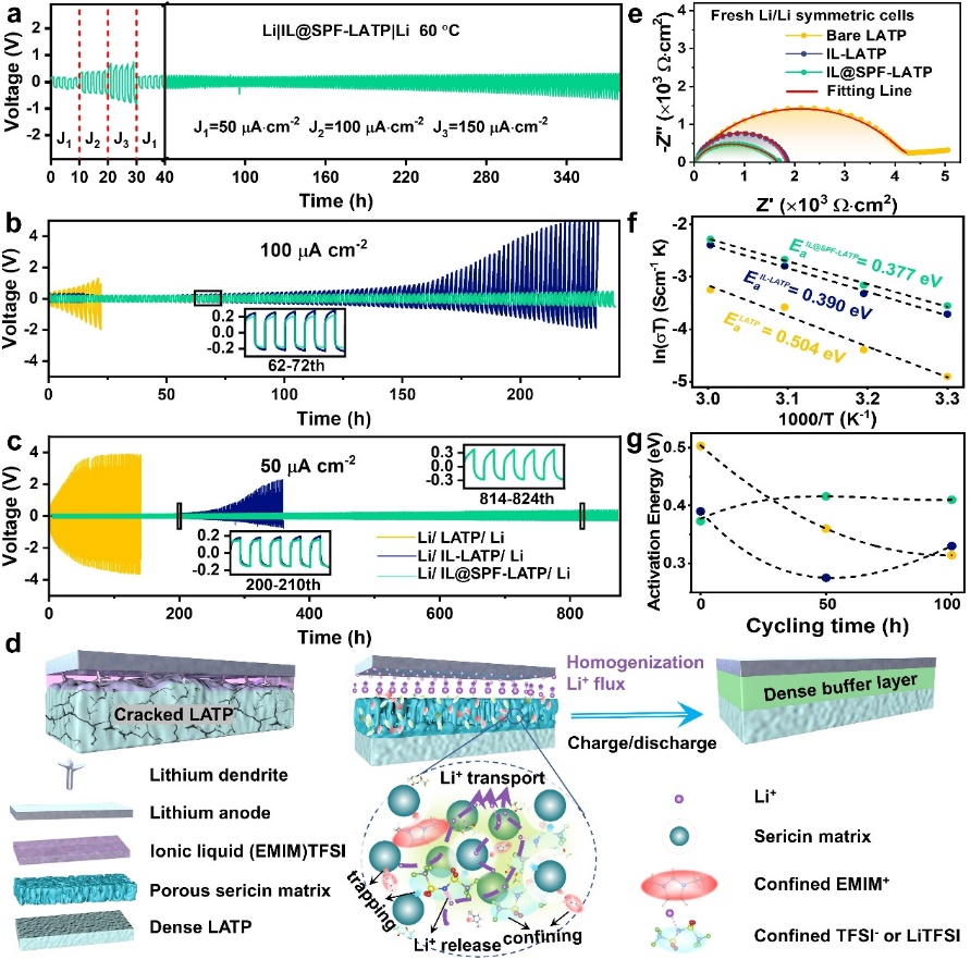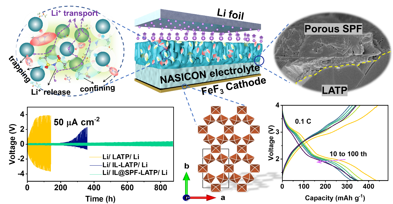 丝胶蛋白大分子由多种氨基酸通过肽键连接而成,本征的电化学稳定性和电子绝缘特性使其满足作为Li-LATP界面中间层的基本要求。此外,丝胶蛋白膜在制备过程中由于溶剂蒸发,其内部出现均匀分布的空腔,这些空腔及其分子极性侧链上亲锂和亲阴离子官能团位点的存在,可通过和TFSI-基团之间的相互作用,高效地捕获和限域作为界面锂离子配线的离子液体(IL)。IL可以均匀分散于整个丝胶蛋白膜中,并得益于其本征的流体特性,可有效抑制Li-LATP界面的分解、钝化和开裂,即使经过长期循环,丝胶蛋白层依然保持保形和紧致的界面形态。IL -丝胶蛋白膜构成的多界面兼容的修饰层可有效降低Li-LATP界面阻抗,抑制体积变化和活性物质溶解,消除LATP还原分解和锂枝晶生长。对应的NASICON基固态Li-Fe-F转换电池首圈比容量高达524.3 mAh g-1,经过100圈充放电后,可逆容量仍保持在346.3 mAh g-1,库伦效率在97~98%。这种具有多功能和高兼容性的生物质衍生界面为NASICON型固态电池的发展和应用提供了一个新的视角(Energy Storage Mater. 2022, 47, 551-560)。