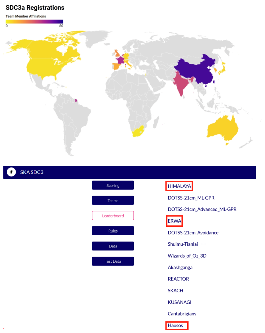 图1:SKA SDC3报名队伍分布(上图)和成绩排行榜(下图)。报名数量较多国家包含中国(77支队伍)、法国(52支队伍)、荷兰(41支队伍)和英国(26支队伍)等。上海天文台SKA射电宇宙学团组牵头的参赛团队提交的3组结果位列成绩排行榜中第1(HIMALAYA)、第4(ERWA)和第13(HAUSOS)。