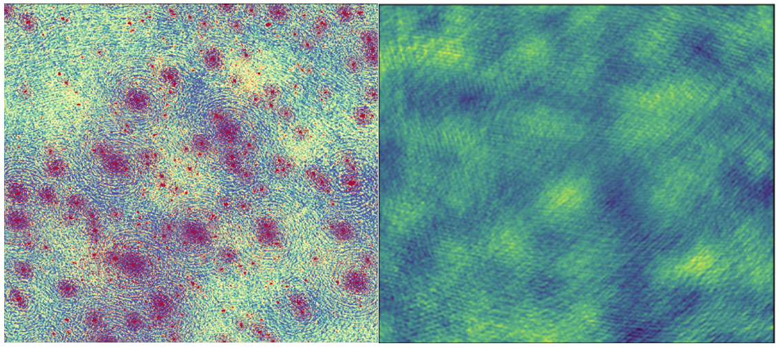 图2:左图为SKA低频干涉阵列端到端仿真图像示意,右图为根据SDC3发布的数据分离得到的EoR信号示意。