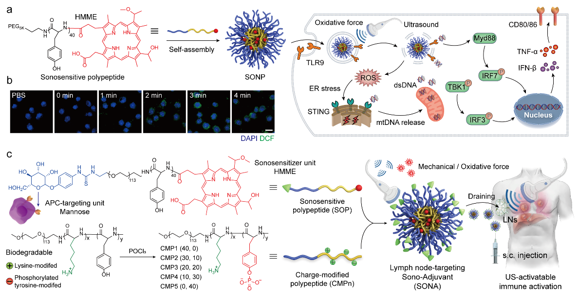 近日,中国科学院上海药物研究所研究团队,构建了超声激活型聚多肽纳米佐剂平台。该平台在超声刺激条件下,能够时空可控地调节淋巴结内先天免疫反应激活,并可普适性地高效递送肿瘤特异性新生抗原多肽,在体内诱导强烈且特异的抗肿瘤T细胞免疫应答。