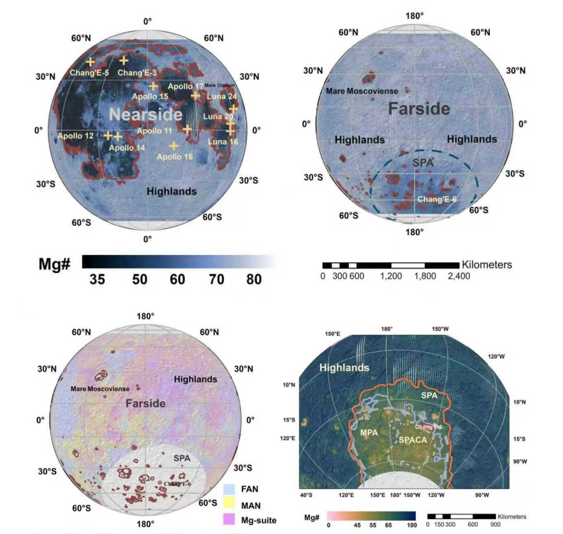 研究团队经多学科联合攻关,将嫦娥六号月球背面实测“月面真值”与月球轨道高分辨率可见—近红外多波段光谱成像数据相结合,并嵌入残差卷积神经网络反演模型。基于模型微调策略,研究团队在有限样本条件下,精准捕捉光谱数据与元素含量间的高度非线性关系,有效解决了传统模型易过拟合、鲁棒性不足等问题,大幅提升了全球尺度氧化物反演精度。研究团队进一步依托“AI+遥感”技术路线,精确重构了铁、钛、铝、镁、钙、硅六大主量元素氧化物及镁指数的全球分布,清晰刻画了月球表面月海、高地、南极—艾肯盆地三大地球化学区的元素分布特征。该成果首次定量揭示了月球背面高地中,镁质斜长岩和镁质岩套的出露比例明显高于近地侧,为月球岩浆洋结晶分化的月球正面与背面不对称性假说提供了新的实测证据,并精准划定了南极—艾肯盆地镁质辉石环与铁质异常区边界,证实南极—艾肯盆地撞击事件挖掘且暴露了更广泛的深部镁质物质。