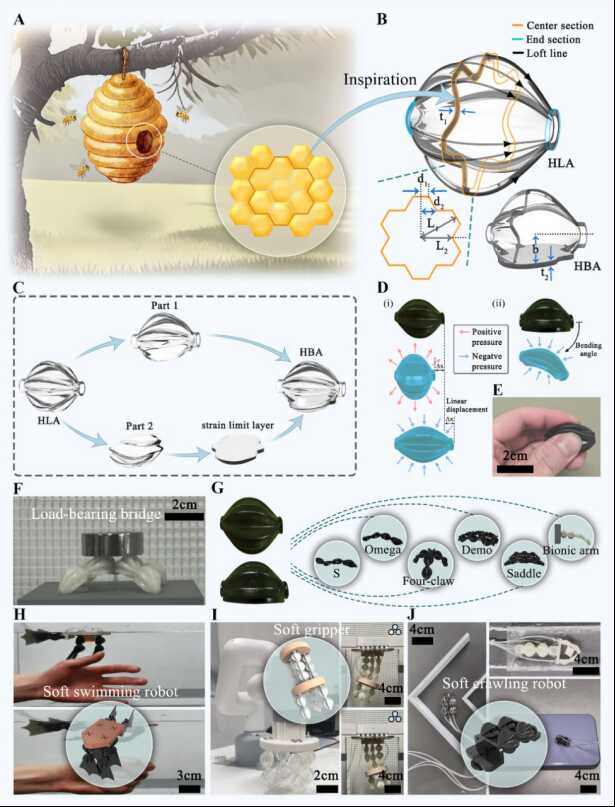 图1.蜂窝启发的线性驱动器(HLA)和弯曲驱动器(HBA)的设计