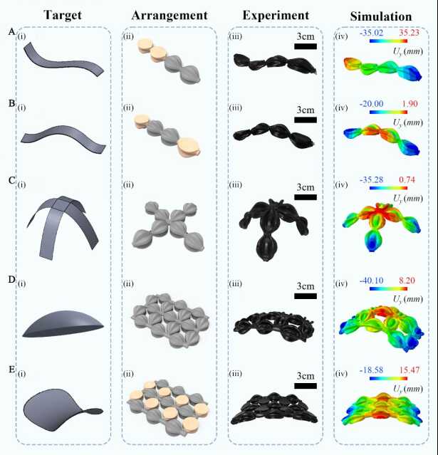 团队还提出了一种模块化设计方法,通过与以上致动器相结合,设计了多种不同形式的软体结构,包括S形,Ω形,四爪形,椭球形和马鞍形面结构(图2),仿生手臂结构以及承重桥结构(图3),展示出了极大的结构设计广度。