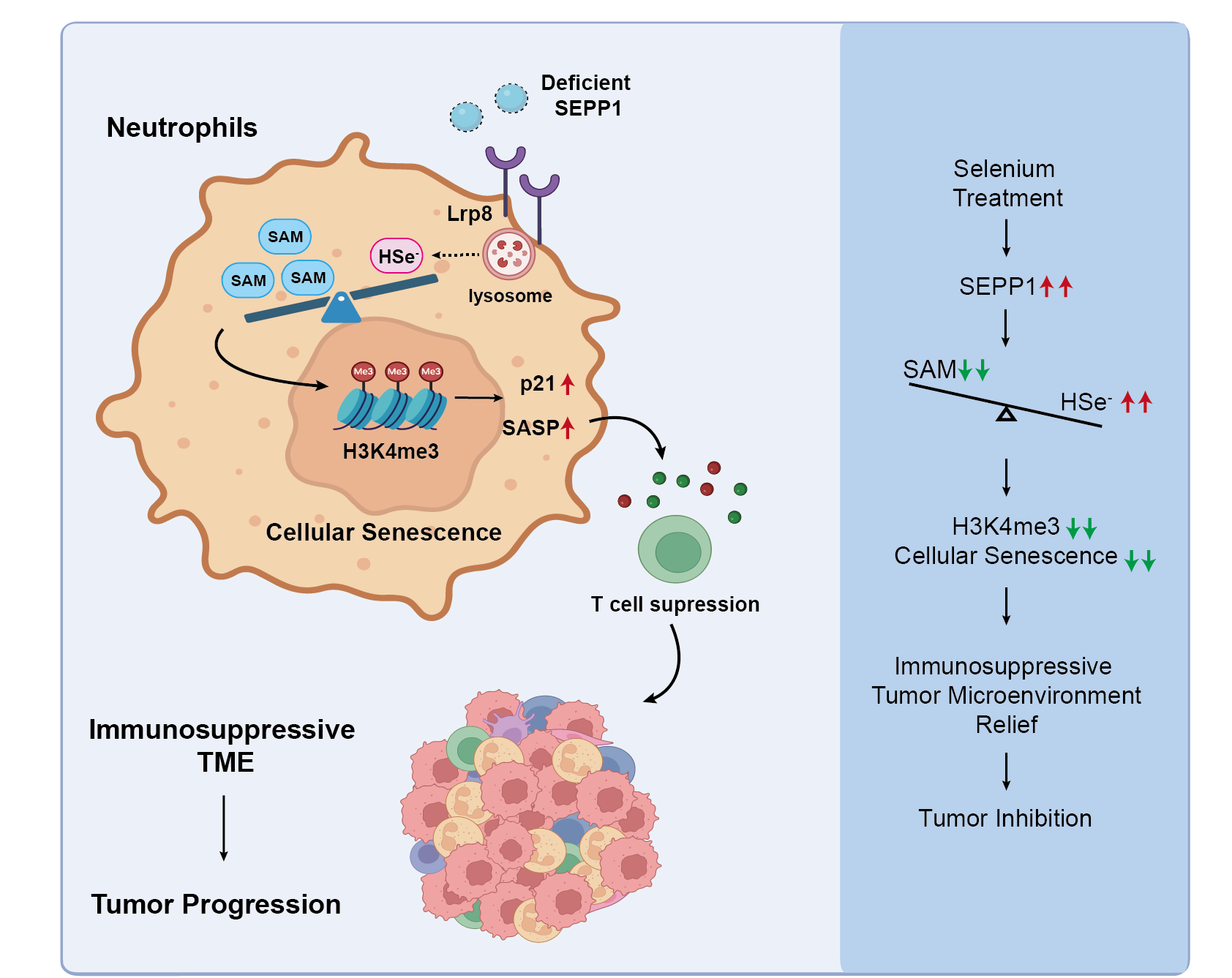 机制研究发现,肿瘤来源的SEPP1,是中性粒细胞通过脂蛋白受体摄取硒的关键载体。当肝癌因高氧化应激压力下SEPP1缺失时,会引发中性粒细胞内硒代谢紊乱,造成硒化氢产量不足及S-腺苷甲硫氨酸累积。这种硒代谢稳态紊乱,会提升相关组蛋白修饰,在表观遗传水平上开启促衰老基因及衰老相关分泌特征基因的表达,驱动中性粒细胞的衰老样重编程表征。