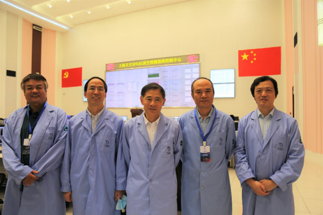 李正华(中)和首次火星探测任务VLBI测轨分系统总指挥洪晓瑜(右二)、总设计师刘庆会(左一)及上海天文台领导合影