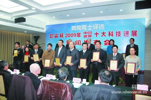 向入选2009年中国十大科技进展新闻的单位代表授牌。徐雁龙/摄