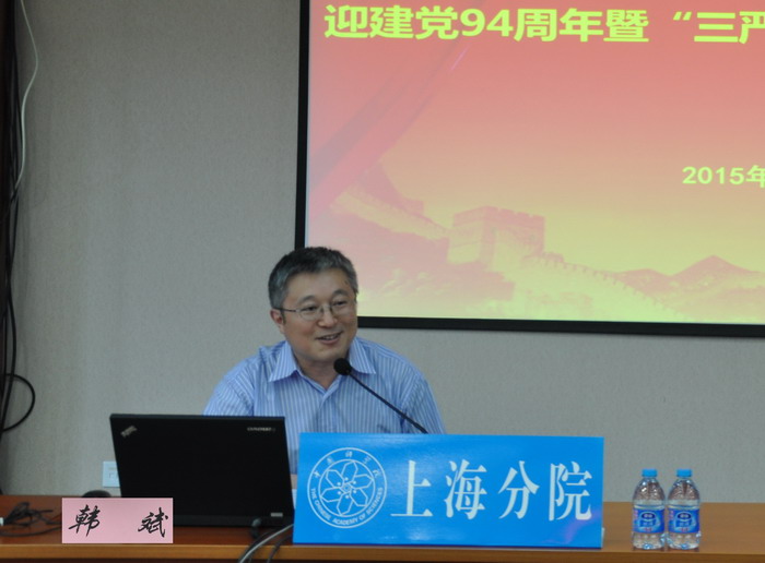 为进一步贯彻落实中国科学院党组有关文件精神,深入开展“三严三实”专题教育活动,值纪念中国共产党诞生九十四周年之际,上海分院党组于7月6日下午举行了“迎接建党94周年暨‘三严三实’专题教育报告会”,邀请了中国科学院院士戴立信、韩斌同志作专题报告。