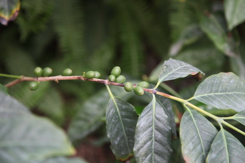 小粒咖啡(Coffea arabica)为茜草科咖啡属小乔木,分枝多,节膨大,叶对生,聚伞花序数个簇生于叶腋,无总花梗,花芳香,花冠高脚蝶状,白色,浆果椭圆形,长约1.5厘米,果实成熟后红色,易脱落,种子2粒,经加工后咖啡味香醇,含咖啡因成分较低。