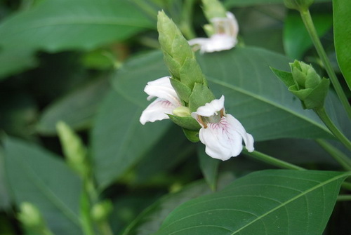 鸭嘴花(Justicia adhatoda)别名牛舌兰、野靛叶,为爵床科爵床属常绿灌木,枝和叶揉碎后有特殊臭味,叶对生,纸质,全缘,穗状花序生枝顶叶腋,苞片大,卵状椭圆形,覆瓦状重叠,绿色,小苞片披针形,稍短于苞片,花冠白色,三唇形,极似鸭嘴,上唇直立,二浅裂,下唇伸展,宽大,3深裂,花冠上有紫色纹,外被短柔毛,雄蕊2,蒴果近木质。该种分布广东、广西、海南和云南,印度至中南半岛也有。