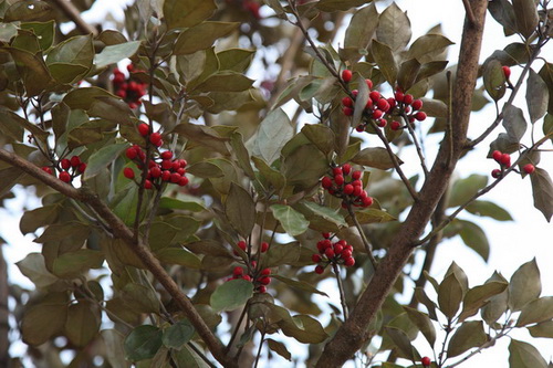 近日,天气转寒,上海辰山植物园(中科院上海辰山植物科学研究中心)珍稀植物园内几株高大的舟山新木姜子依然生机盎然,鲜红圆润的果实簇生在枝条上,在绿叶丛中分外耀眼。