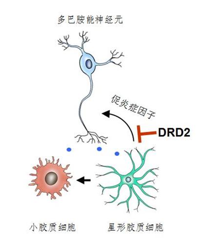 星形胶质细胞中的多巴胺D2受体(Drd2)正常情况下通过αB-晶状体蛋白抑制炎症介质相关基因的表达,从而发挥抑制炎症的作用,而小胶质细胞表达的Drd2则对该类细胞炎症因子的产生没有显著影响。