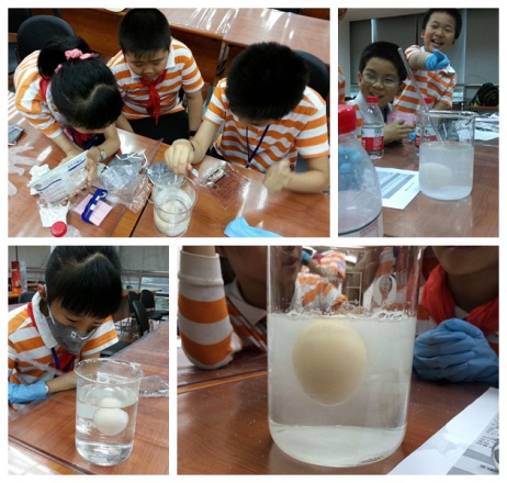 之后,小朋友体验了“会悬浮的鸡蛋”和“会游泳的鸡蛋”,亲眼目睹了鸡蛋的精彩表演。小朋友们小心翼翼地将鸡蛋放入一个装了清水的烧杯中,鸡蛋乖乖地躺在杯底。接着一边轻轻搅拌一边缓慢加入食盐,随着水中食盐浓度的增加,鸡蛋也不再安分地躺在杯底,犹如雨后的春笋挣脱束缚,好奇地探出了脑袋,四处张望着外面的世界。“浮出来了、浮出来了”,教室里响起了小朋友们的欢呼,带着些许惊喜。“食盐的加入,改变了水的比重,当盐水的比重大于鸡蛋的比重时,鸡蛋就像搭乘了电梯,从水底来到了水面。”王博士解释道。小朋友们见识了“比重”的神奇力量之后,又踏上了新的科学旅程。同样,小朋友们在一个装了清水的烧杯中放置了鸡蛋,这一次慢慢注入的是稀盐酸,蛋壳表面冒出了一个又一个气泡,不一会儿工夫,表面上挤满了一个个小小的气泡,在众多气泡的簇拥下,鸡蛋高昂着头徐徐地漂浮上来,舞姿尤为妙曼!“难道是因为比重?”有点小朋友开始猜测。“这可是一个新的科学原理哦,”王博士望着小朋友们微笑着说,“鸡蛋壳中的碳酸钙与稀盐酸反应产生大量二氧化碳气体,也就是大家所看到的蛋壳表面的气泡,产生的浮力使鸡蛋上升。这些气泡才是将鸡蛋缓缓推出水面的无形的手哦!”“原来这样呀!”经过王博士深入浅出的解释,向小朋友们揭开了神秘的科学面纱。