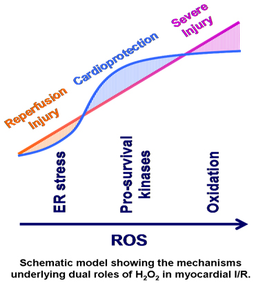 博士研究生王志华、刘金龙等在杨黄恬研究员的指导下发现H2O2PC和PoC在10-100 mmol/L浓度依赖地激活RISK信号通路、抑制其下游的糖原合成酶激酶(glycogen synthase kinase, GSK)3-b活性,进而改善I/R后心功能;而低浓度(1-3 mmol/L)及高浓度(1 mmol/Lol/L) H2O2他则通过不同的机制加重了I/R后心功能不全。低浓度H2O2PC和PoC (1-3 mmol/L) 通过进一步上调心肌I/R导致的ER stress加重了I/R后心肌损伤,该效应在3 mmol/L H2O2处理下达到平台期;而高浓度H2O2 (≧100 mmol/L)则通过促进氧化应激反应加重I/R后心肌损伤。研究发现证明了浓度是决定ROS不同作用的重要因素之一,揭示了ROS导致心肌I/R损伤和保护作用的浓度阈值和其内在机制,其最终表现是不同浓度ROS启动/激活的损伤与保护通路博弈的结果。研究发现还为解释ROS矛盾作用的机理提供了新的视角,并为开发基于ROS的缺血性心脏病的治疗措施提供了新的实验证据。