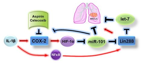 刘默芳研究员与上海市胸科医院检验科主任娄加陶教授联合培养研究生王琳和刘默芳组助理实验师张凌飞等发现,促炎性细胞因子IL-1b在NSCLC患者血清中剧烈升高,并促进NSCLC细胞增殖和迁移;而IL-1b对抑癌性miR-101的表达抑制对其促癌作用至关重要。该工作进一步发现,miR-101靶向性抑制一个在癌症中有多重功能(包括肿瘤干细胞)的致癌性RNA结合蛋白--Lin28B的表达,并解除了Lin28B对抑癌性Let-7家族miRNA的表达抑制。有趣的是,非甾体类抗炎药物阿司匹林和Celecoxib可有效地逆转IL-1b对miR-101、Lin28B及Let-7表达的调控。这些发现揭示了促癌性炎症致肺癌发生的新机制,并为阿司匹林等非甾体类抗炎药物的潜在抗癌效应提供了新的证据,完善了其抗癌作用的分子机理,为这些药物更加合理、有效、安全用药提供了科学依据。
